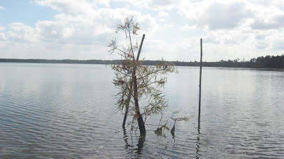 As we paddled along we saw what appeared to be newly planted little trees with supports. I don't know for sure who was planting them although I assume the forest service is doing it. I'm not sure why they would be since there are many cyprus here already. And I'm really curious how in the world they do it. There were 8 or 10 planted in certain areas of the lake.