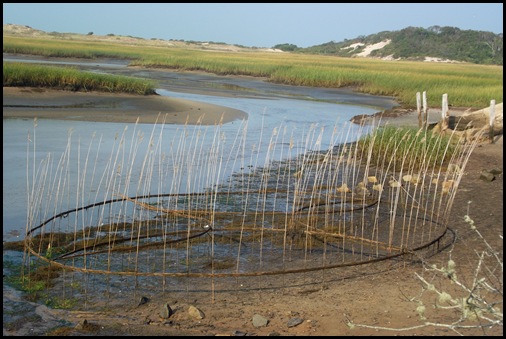 When I step out of the car the mud flats are all around and as I look over them I see what appears to be an environmental sculpture. If it weren’t for Andy Goldsworthy, I wouldn’t have had a clue what this is. Sure wish I could have seen this being constructed and met the artist. Hope I can be here again at high tide to see what is visible at that time. I’m betting it just looks like some grasses in the water. The structure is an intricately woven design holding the grasses in place.