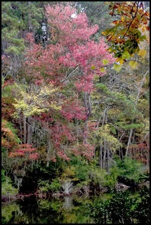 The pines here are very tall and it is a wonderful trail just a bit longer than 3/4 of a mile we thought which was just fine. The trail leads to this huge beautiful water filled sinkhole looking particularly wonderful on this perfect fall day.
