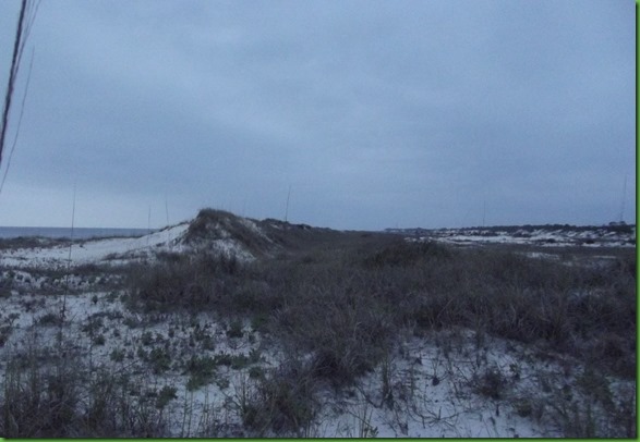 I start the day with what will probably become my ritual here. No manatee to see but with the island actually facing somewhat East due to the panhandle I can see the sunrise over the gulf. Odd isn’t it. The island sits at an angle SW to NE so the shoreline faces SE . But no sunrise today. WAY too cloudy. Although later in the day perhaps the 20+ mph winds will blow the clouds away and the sun will come out. It’s actually deep blue at dawn when I am first seeing the dunes.