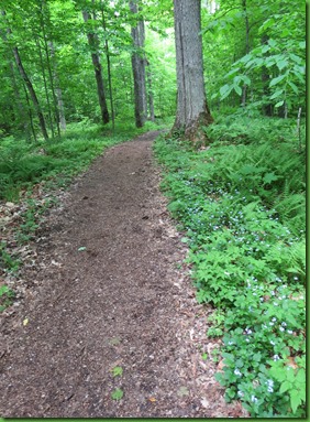 We both agree when we get back to the top of this boardwalk that it must have been less steep than the one with 94 steps that we climbed to the top of the falls. Or that one put us in better shape to do this one. Our trip back to the parking lot was on the fern and bluet covered nature trail. We had to put the mosquito gear all on for that walk.