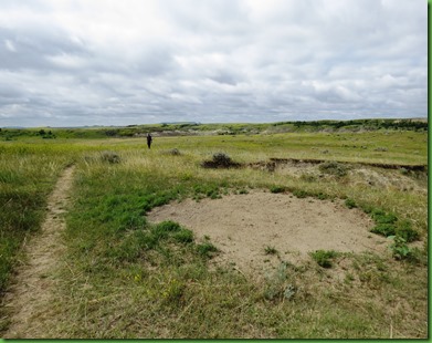We aren’t very far out into the prairie when we pass a buffalo wallow where they like to roll. Their rolling of course denudes the ground and it becomes just the big circle of the dust they want. I’m looking back at David coming out of the Petrified Rock area.
