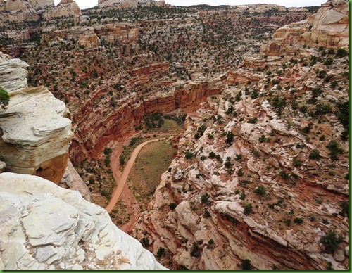 The trail becomes narrow and and winds around the edge of the cliffs above the dirt road which brought us in. When the rains come, this road is a wash and impassible. They suggest you check the weather before coming on either of these hikes as people have gotten stranded in here unable to get out.