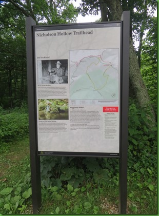We arrive at the trailhead. We’re taking the Corbin Cabin Trail down to the Cabin and the then the Nicholson Hollow Trail back out for about a 5 mile loop. From “You are Here” we’ll go down on the yellow trail. The cabin is at the bottom. We’ll come back out the other longer yellow trail which has less of a grade. To complete the loop, we cross the road and pick up…..you guessed it…..the AT, which here is in red. We take it North back to the parking area.