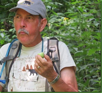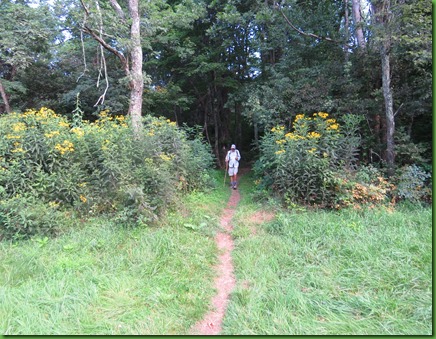We come to our first crossing of Skyline Drive. I get a picture of David coming out of the woods amid giant plants over his head. He gets one of me crossing the drive and re-entering the woods.