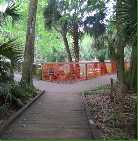 The boardwalk takes me right to the spring which unfortunately is blocked by this totally ugly orange net fencing. It appears a piece of the cement walkway has cracked and has yet to be repaired.