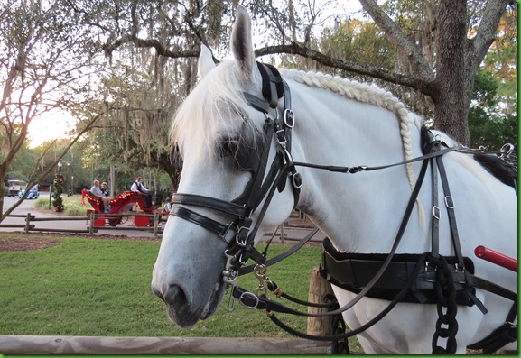 After setting up we head over to the Trading Post areas and on the way we pass one of several “sleigh rides” complete with sleigh bells on the horses. The sleighs have wheels of course but they are decorated with greenery. The season is totally festive at Disney World as you would expect.